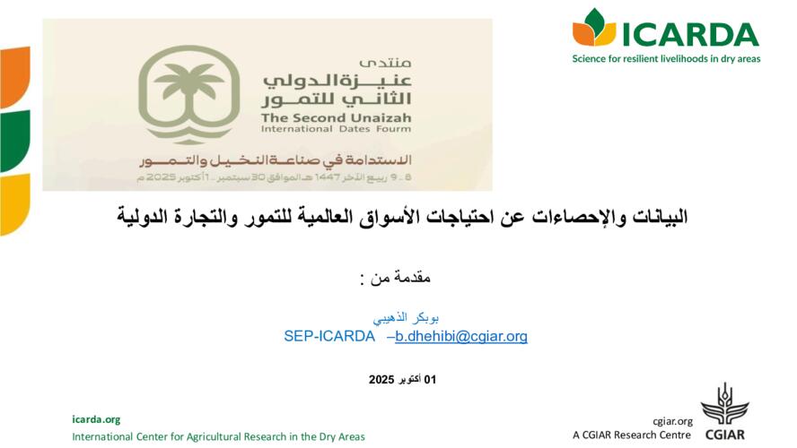 Conduct research and development to produce new knowledge and practices to improve date palm production systems in the Gulf region by allowing improvement of productivity of cultivars, management of natural resources (land and water) for optimal performance, optimization of use of different inputs in the cropping process (fertilizers, pollinators, wastewater, etc.), and studying the genetic diversity of date palms.