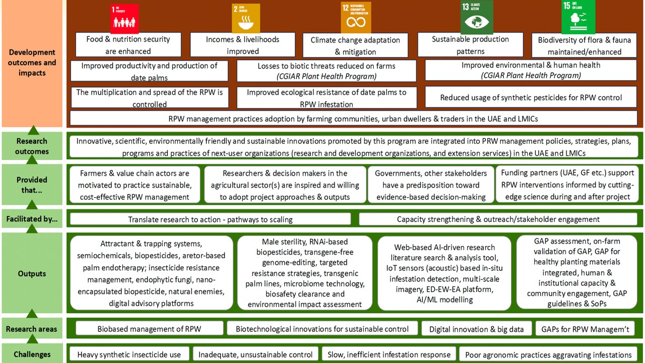This program entails the use of multi-pronged, integrated innovations in pest management that target various stages of the PRW lifecycle, address the factors that make date palms susceptible to RPW infestation, and aim at resolving the systemic barriers to adoption of sustainable RPW management technologies. The program will deploy innovative biobased solutions (Workstream 1), biotechnological innovations (Workstream 2), digital innovations (Workstream 3), GAP innovations (Workstream 4) and stimulate the adoption of these innovations bundling optimal innovation packages, developing elaborate innovations scaling roadmaps, conducting socio-economic and policy research and providing insightful policy advice and conducting citizen-centered monitoring of the innovations (Workstream 5).